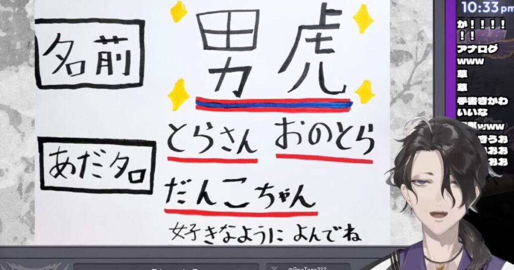 出典:【初配信】はじめまして、男虎というものです【にじさんじ】(18:16〜
